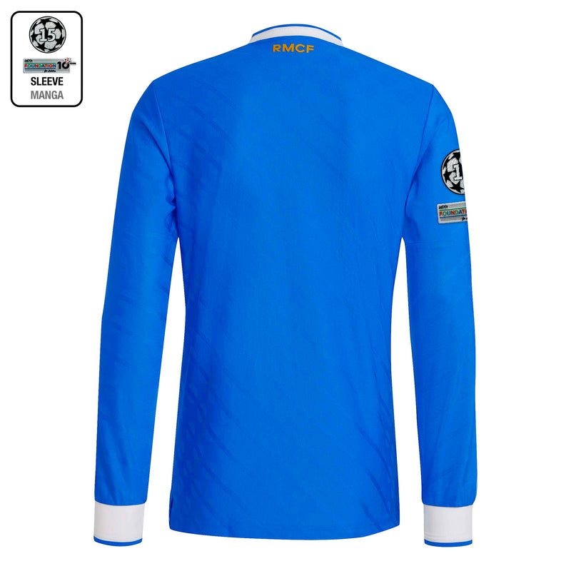 En casa, vestimos de azul. Esta camiseta manga larga de la tercera equipación del Real Madrid es del color favorito de los madridistas y los fans de las 3 bandas. Este color clásico de adidas Originals, que también rinde homenaje a la identidad del equipo del Bernabéu, es el tono perfecto para celebrar la alianza definitiva del fútbol. Las 3 bandas dentadas y el trébol son un guiño a la historia de adidas. La tecnología transpirable AEROREADY te permite concentrarte en lo importante.